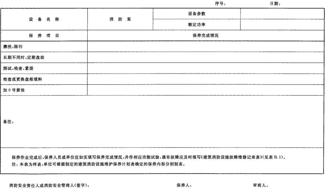4、實施建筑消防設(shè)施的維護(hù)保養(yǎng)時,應(yīng)填寫《建筑消防設(shè)施維護(hù)保養(yǎng)記錄表》(見下表2)并進(jìn)行相應(yīng)功能試驗。