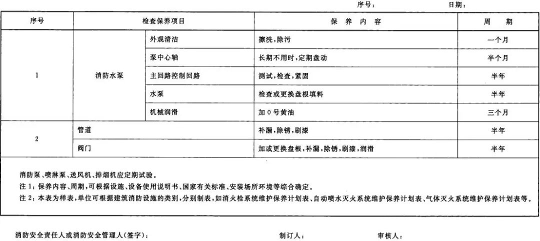 1、建筑消防設(shè)施維護(hù)保養(yǎng)應(yīng)制定計劃,列明消防設(shè)施的名稱、維護(hù)保養(yǎng)的內(nèi)容和周期,見下表1。