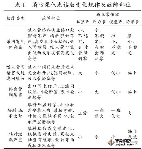 與正常值相比,消防泵儀表讀數(shù)變化規(guī)律及故障部位如表 1 所示。