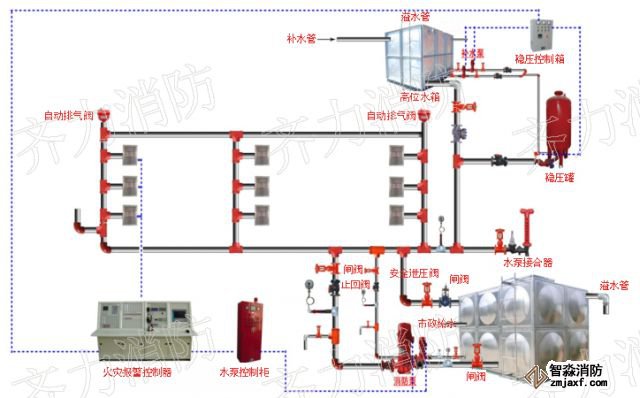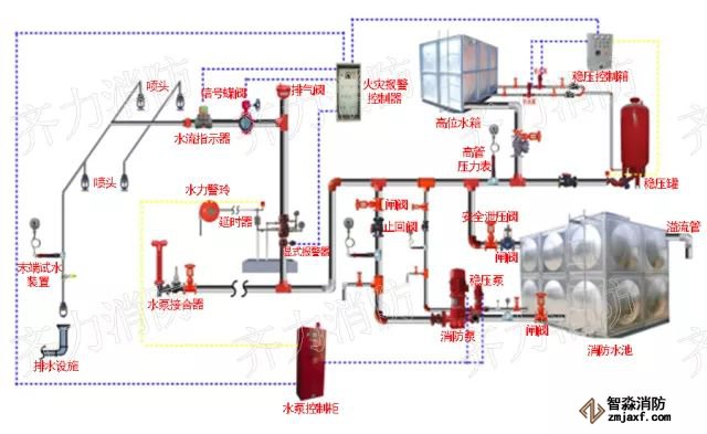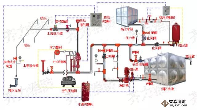 1)開啟最不利處末端試水裝置,查看壓力表顯示;查看水流指示器、壓力開關(guān)和消防水泵的動作情況及反饋信號。