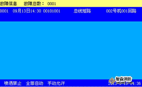 消防報(bào)警系統(tǒng)某個(gè)回路總線發(fā)生短路、線間電流過大時(shí),控制器發(fā)出聲、光報(bào)警,同時(shí)在液晶屏上以中文顯示總線短路(見下圖),打印機(jī)、歷史記錄記錄相應(yīng)的故障信息。
