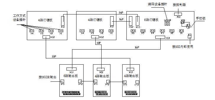 燈鍵板與輸出板通過16P和10P數(shù)據(jù)線連接,其結(jié)構(gòu)連接圖如圖7-4所示。