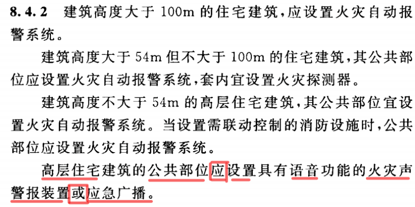 我們先來看“建規(guī)”(GB 50016-2014《建筑設(shè)計防火規(guī)范》(2018年版))中對于高層住宅建筑設(shè)置消防設(shè)備的規(guī)定。其中8.4.2要求“公共部分應(yīng)設(shè)置具有語音功能的火災(zāi)聲警報裝置或應(yīng)急廣播”,因此有的高層住宅項目的火災(zāi)報警系統(tǒng)設(shè)計圖紙上設(shè)計采用“語音型聲光”,有兩種比較特殊的方式:只有語音型聲光,沒有消防應(yīng)急廣播;語音型聲光+消防應(yīng)急廣播。