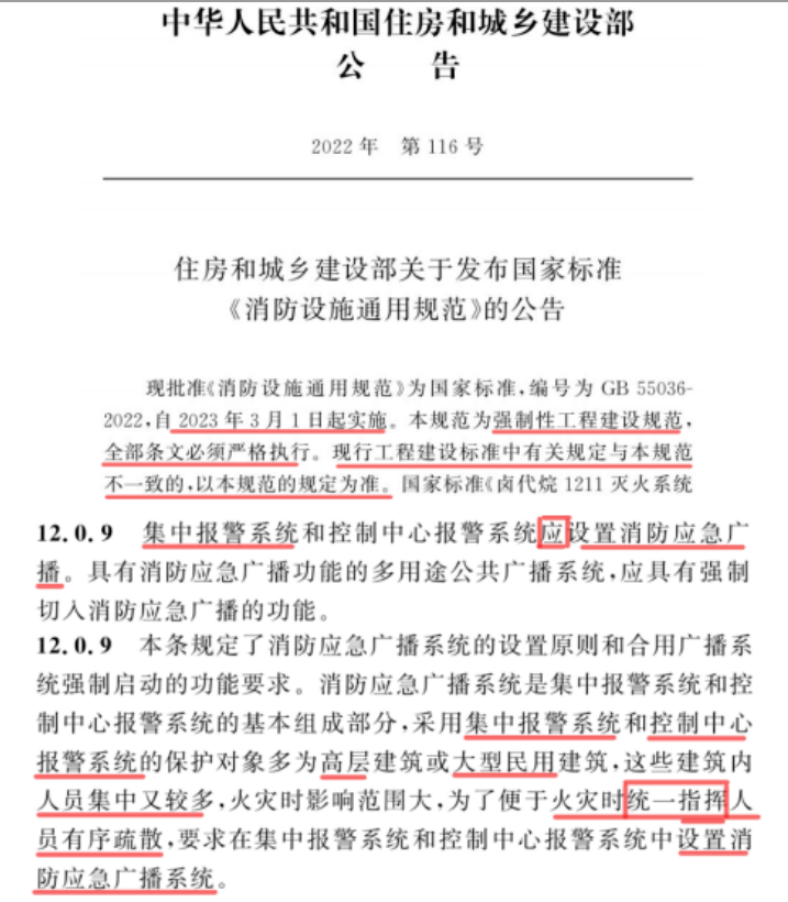 全文強制執(zhí)行的GB 55036-2022《消防設(shè)施通用規(guī)范》(現(xiàn)行其他規(guī)范規(guī)定與通規(guī)不一致時,以通規(guī)為準)的12.0.9有明確的要求,集中報警系統(tǒng)必須設(shè)置消防應(yīng)急廣播,目的是對于人員集中場所在火災(zāi)后“統(tǒng)一指揮”人員有序疏散。參照火規(guī)GB 50116對于“集中報警系統(tǒng)”的定義:1臺具有集中控制功能的報警聯(lián)動控制器、有消控室,根據(jù)項目實際情況(有無消控室?有無聯(lián)動控制器+模塊、消火栓按鈕?),可以自行對只設(shè)計了語音聲光、沒有設(shè)計消防應(yīng)急廣播的合規(guī)性進行判斷。