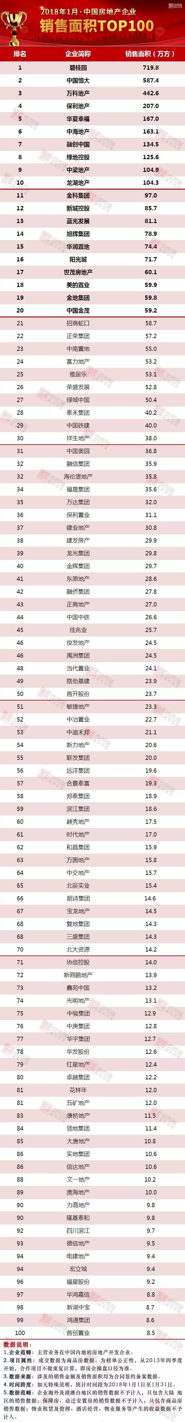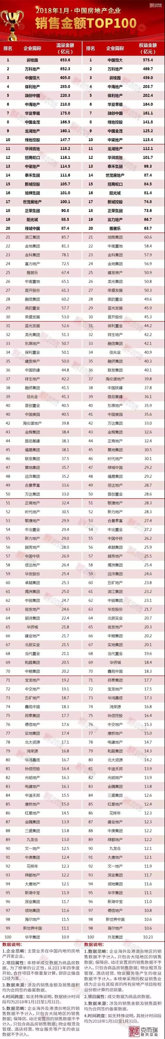 2018年1月中國房地產企業(yè)銷售TOP100排行榜發(fā)布