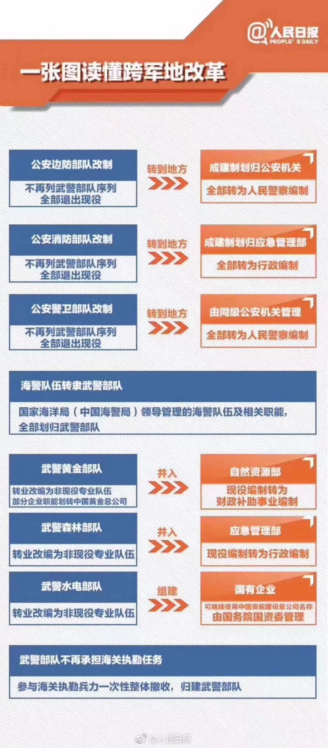 著眼全面落實黨對人民解放軍和其他武裝力量的絕對領導,貫徹落實黨中央關(guān)于調(diào)整武警部隊領導指揮體制的決定,按照軍是軍、警是警、民是民原則,將列武警部隊序列、國務院部門領導管理的現(xiàn)役力量全部退出武警,將國家海洋局領導管理的海警隊伍轉(zhuǎn)隸武警部隊,將武警部隊擔負民事屬性任務的黃金、森林、水電部隊整體移交國家相關(guān)職能部門并改編為非現(xiàn)役專業(yè)隊伍,同時撤收武警部隊海關(guān)執(zhí)勤兵力,徹底理順武警部隊領導管理和指揮使用關(guān)系。