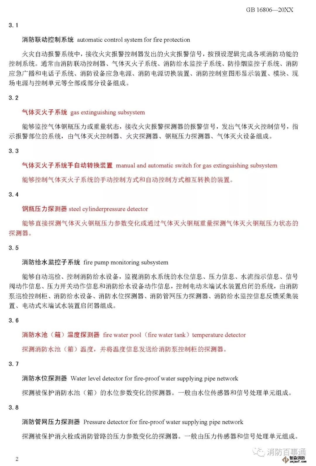 00002——增加了氣體滅火子系統(tǒng)、鋼瓶壓力探測器、消防給水監(jiān)控子系統(tǒng)、消防水位探測器、消防管網(wǎng)壓力探測器、消防給水監(jiān)控模塊、電動式末端試水裝置啟閉器、防排煙監(jiān)控子系統(tǒng)、消防應(yīng)急疏散余壓探測器、消防應(yīng)急疏散電動泄壓風(fēng)閥執(zhí)行器、消防系統(tǒng)報警總線、消防系統(tǒng)聯(lián)動總線、消防系統(tǒng)設(shè)備控制總線的定義(3);