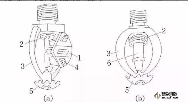 自動(dòng)噴頭是閉式自動(dòng)噴水滅火系統(tǒng)的關(guān)鍵組件,系通過熱敏感釋放機(jī)構(gòu)的動(dòng)作而噴水。它由噴水口、溫感釋放器(控制器)和濺水盤組成,其形狀和樣式較多,下圖為常用的低熔點(diǎn)金屬控制器自動(dòng)噴頭和爆炸瓶式自動(dòng)噴頭。