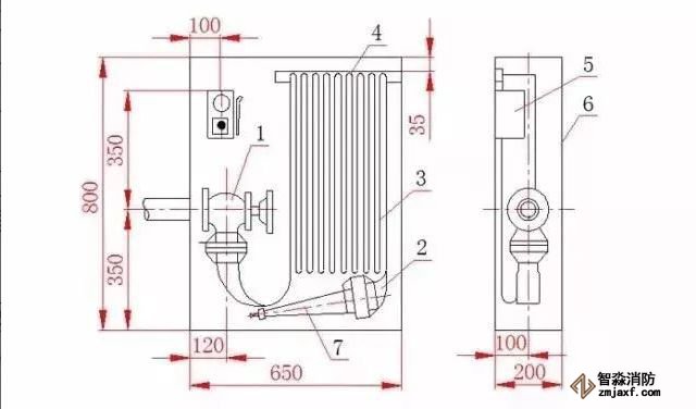 1-消火栓;2-水帶接口;3-水帶;4-掛架;5-消防水泵按鈕;6-消火栓箱;7-水槍