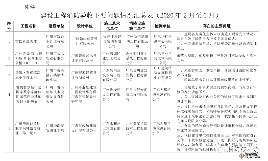 附件:建設(shè)工程消防驗(yàn)收主要問題情況匯總表(2020年2月至6月)