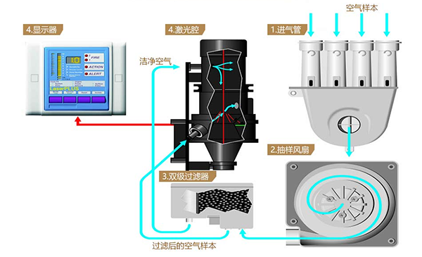 而主動(dòng)式探測(cè)的感煙探測(cè)器是利用抽氣泵主動(dòng)將空氣吸進(jìn)去進(jìn)行煙霧濃度檢測(cè)。