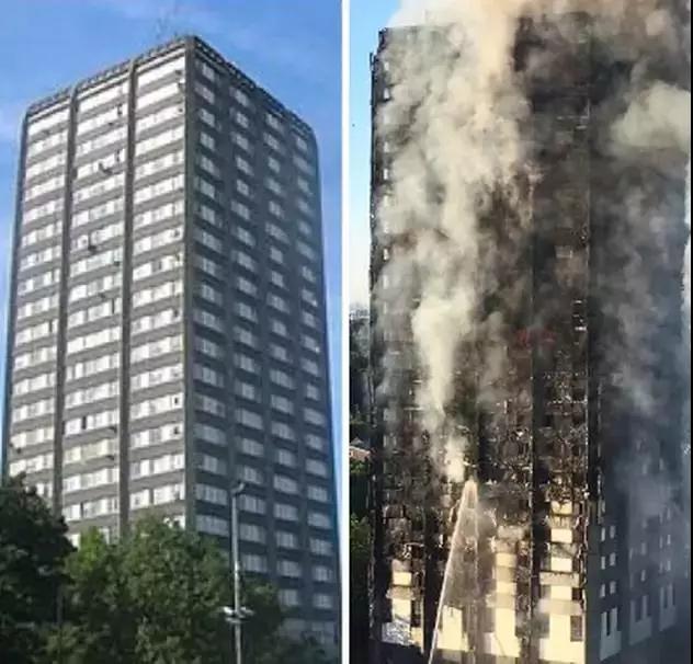 圖為大樓起火前后對(duì)比圖)