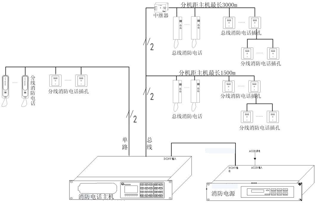 遠距離消防電話系統(tǒng)為總線消防電話系統(tǒng),由消防電話總機、總線消防電話分機、總線消防電話插孔、手提消防電話分機、外供DC24V消防直流電源及24V備用電池構(gòu)成。通訊距離可達到4500M。