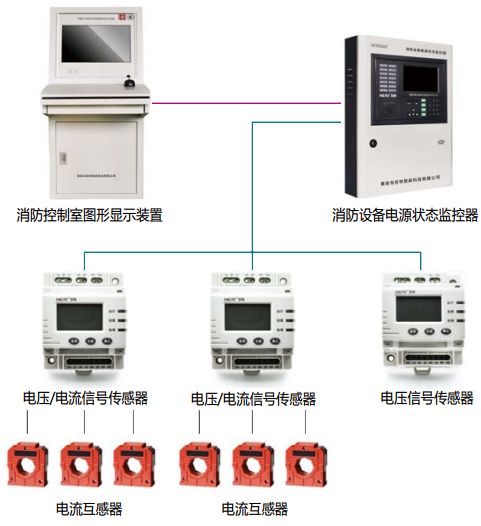 消防設(shè)備電源監(jiān)控系統(tǒng)由消防設(shè)備電源狀態(tài)監(jiān)控器、電壓信號傳感器、電壓電流信號傳感器、電流互感器組成。發(fā)現(xiàn)相關(guān)故障及時處理,從而有效避免火災(zāi)發(fā)生時消防設(shè)備由于電源故障而無法運行的情況,以保證消防設(shè)備可靠地運行。