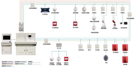 火災(zāi)自動報警系統(tǒng)由火災(zāi)報警主機、圖形顯示裝置、火災(zāi)報警區(qū)域控制器、氣體滅火控制器、感煙探測器、手動報警按鈕、聲光警報器、信號模塊、控制模塊等組成。實現(xiàn)本報警區(qū)域內(nèi)的火災(zāi)報警及相關(guān)設(shè)備的聯(lián)動控制。