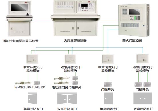 防火門監(jiān)控系統(tǒng)由防火門監(jiān)控器、防火門監(jiān)控模塊、防火門門磁開關(guān)、防火門電磁釋放器、防火門電動閉門器等部件組成。防火門的開閉在人員疏散中起到至關(guān)重要的作用。疏散通道途經(jīng)的防火門狀態(tài)信息必須反饋至消防控制室或有人值班場所內(nèi)的防火門監(jiān)控器。