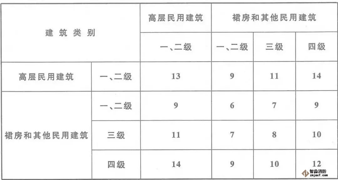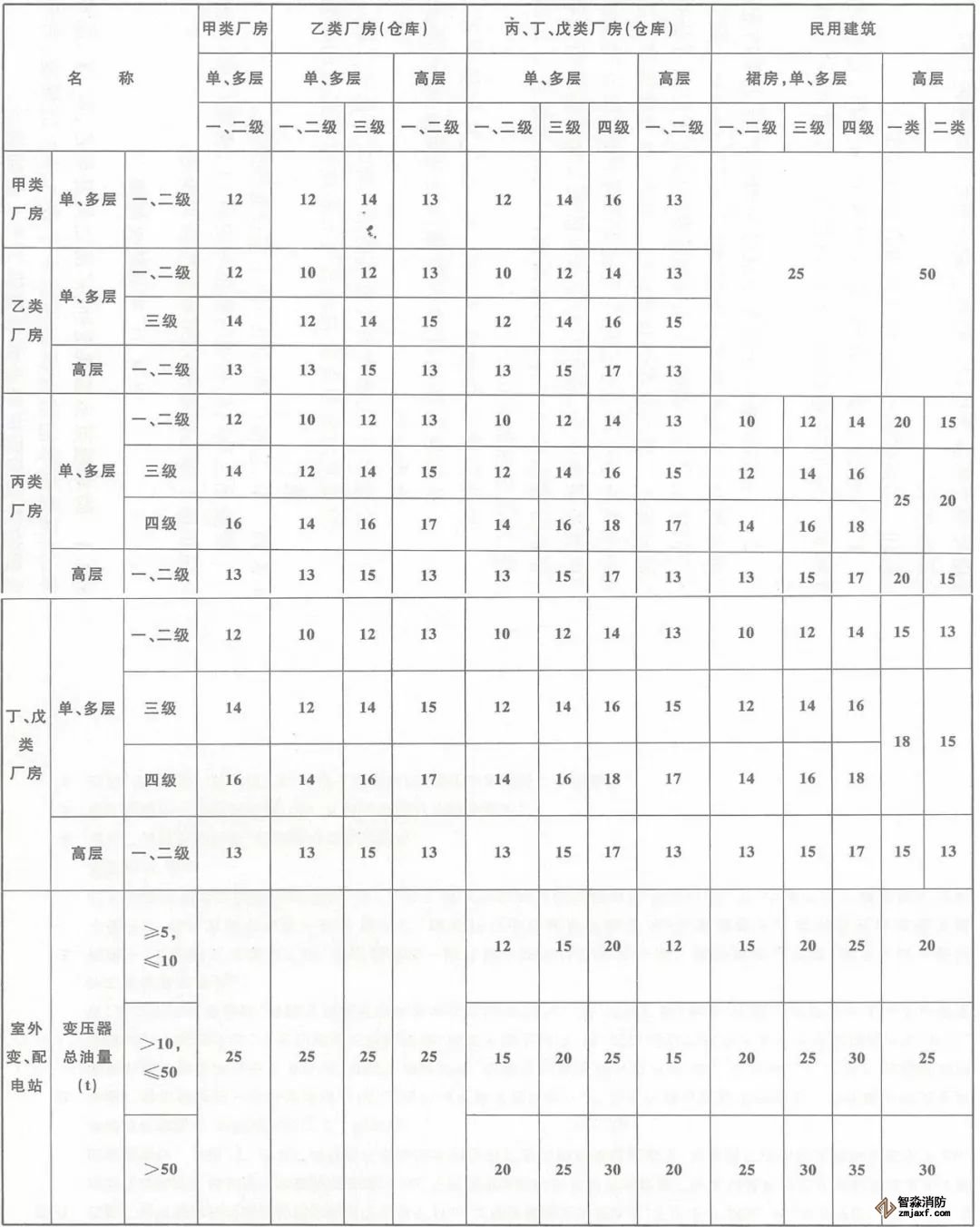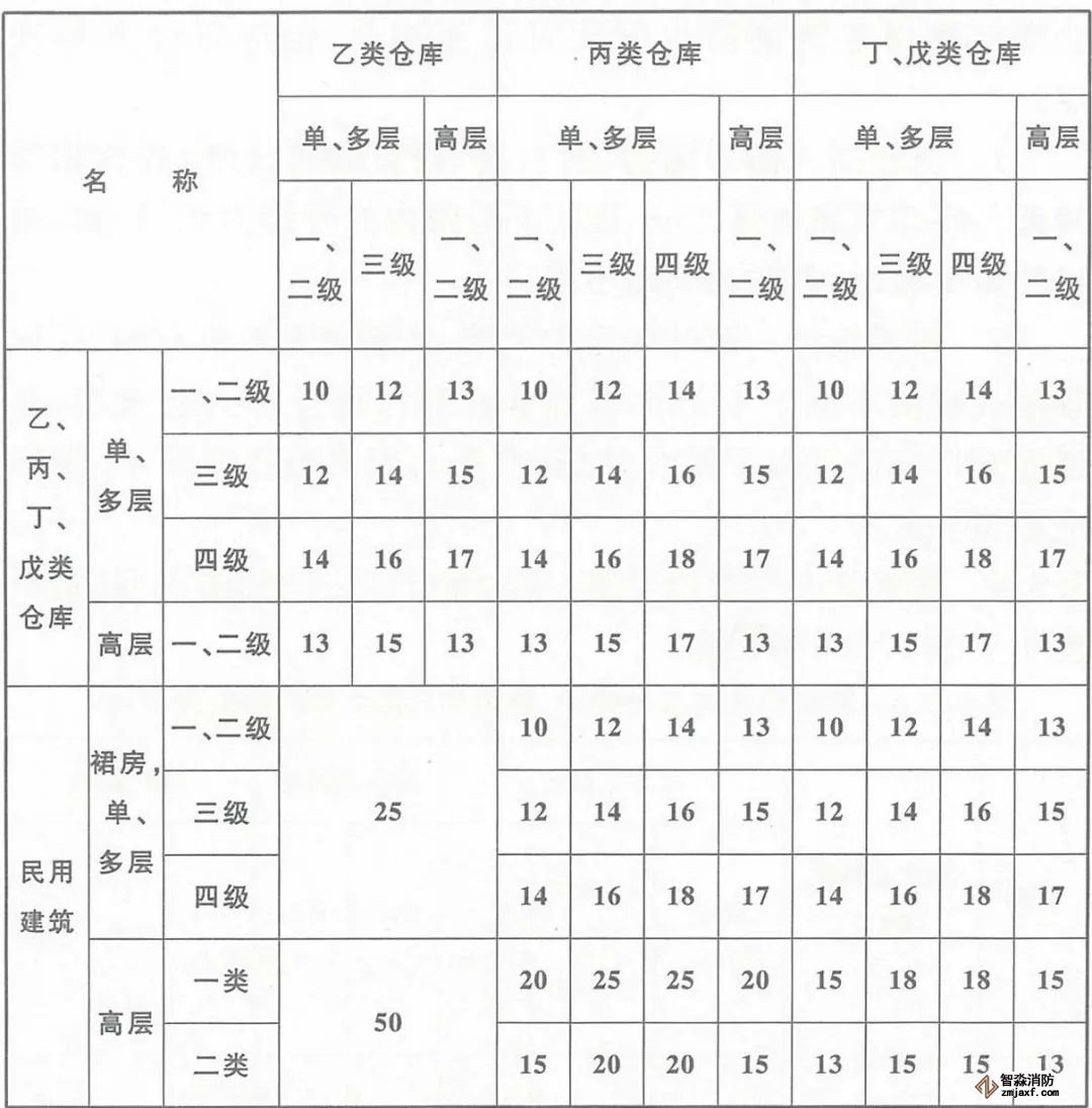 ◆ 廠房之間及與乙、丙、丁、戊類倉庫、民用建筑等的防火間距(m)