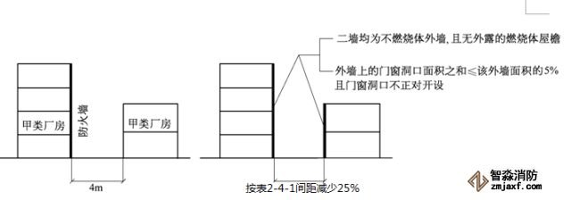③墻:將建筑物的普通外墻改造為防火墻或減少相鄰建筑的開口面積,如開設(shè)門窗應(yīng)采用防火門窗或加防火水幕保護;設(shè)置獨立的室外防火墻,在設(shè)置防火墻時,應(yīng)兼顧通風(fēng)排煙和破財撲救,切忌盲目設(shè)置,顧此失彼。