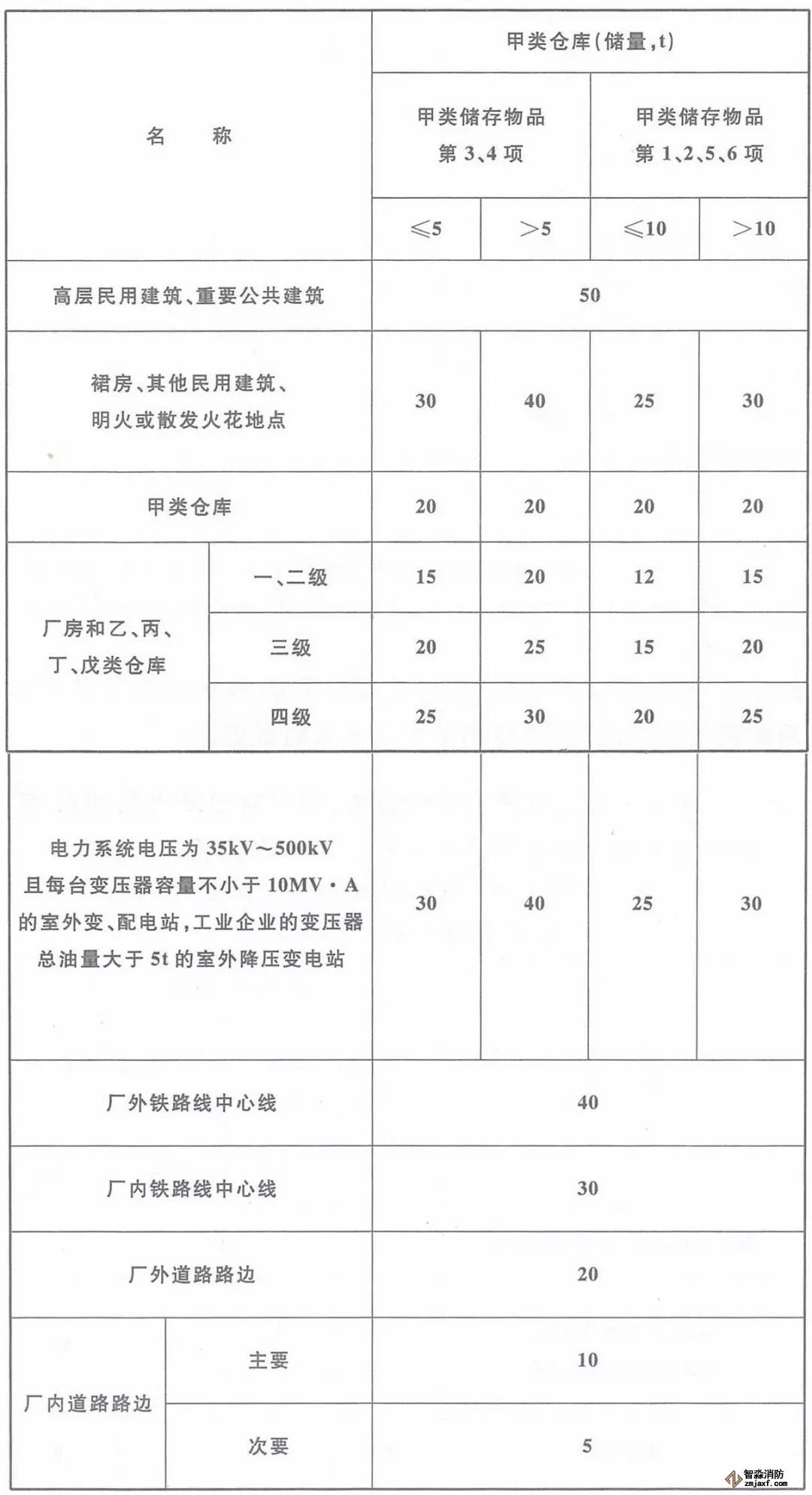 ◆ 甲類倉庫之間及與其他建筑、明火或散發(fā)火花地點、鐵路、道路等的防火間距(m)