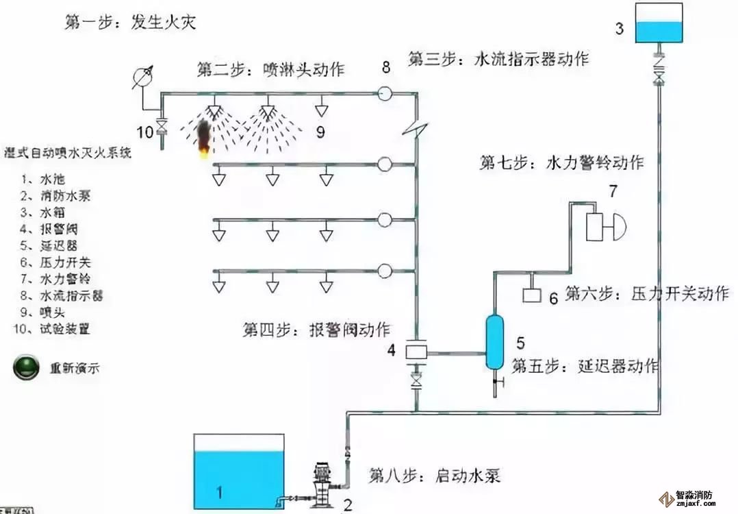 系統(tǒng)組成:由開(kāi)式噴頭、雨淋閥、火災(zāi)自動(dòng)探測(cè)報(bào)警裝置、水力警鈴和供水管路組成。