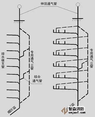 當(dāng)建筑物層數(shù)和衛(wèi)生器具較多時(shí),因排水量大,空氣流動(dòng)過(guò)程宜受排水過(guò)程干擾,須將排水管和通氣管分開(kāi),設(shè)專用通氣管道。