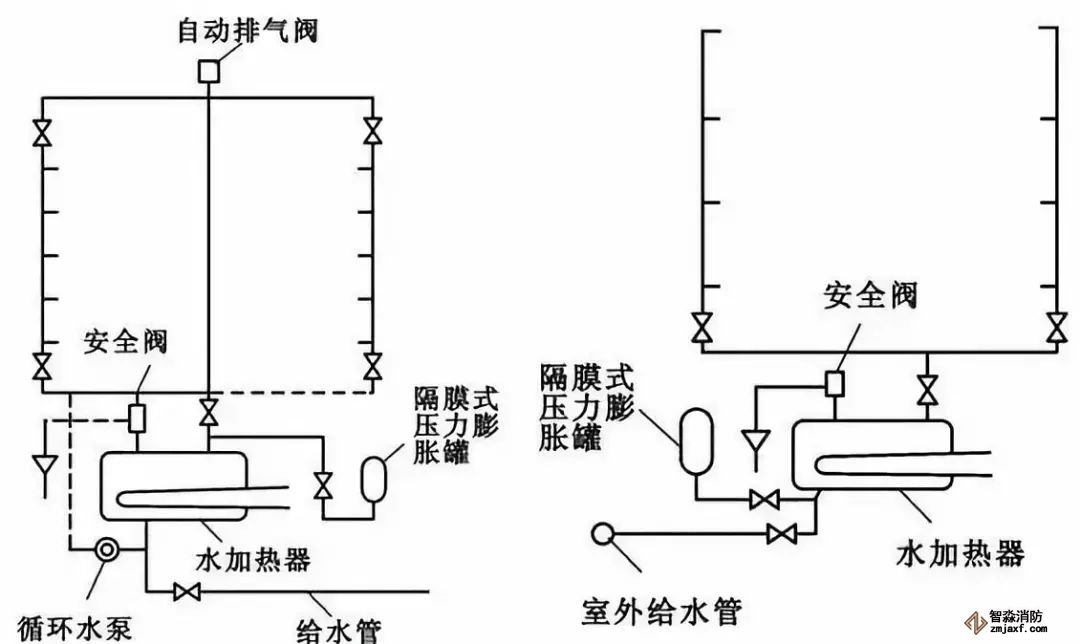 該方式適用于室外給水管網(wǎng)水壓波動(dòng)大,用戶用水水壓要求穩(wěn)定的情況。該方式的管道系統(tǒng)中,必須設(shè)置高位冷水箱和膨脹水管,或開(kāi)式加熱水箱。
