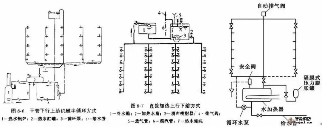 (3)按熱水管網(wǎng)設(shè)置循環(huán)管網(wǎng)的方式不同:全循環(huán)、半循環(huán)、無(wú)循環(huán)。
