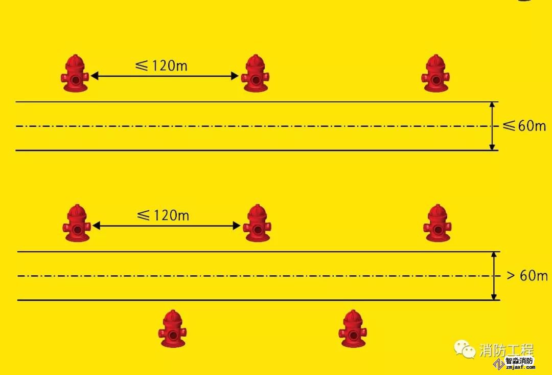 宜在道路的一側(cè)設(shè)置,并宜靠近十字路口,但當市政道路寬度超過60.0m時,應(yīng)在道路的兩側(cè)交叉錯落設(shè)置市政消火栓。