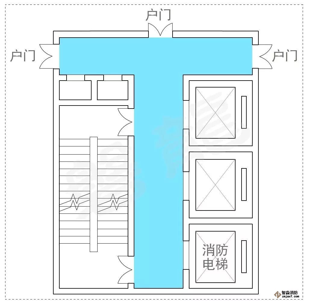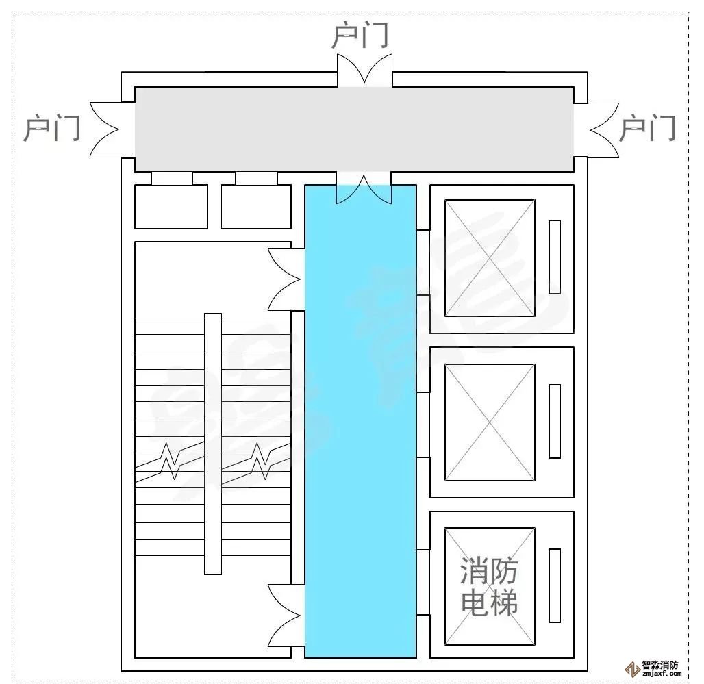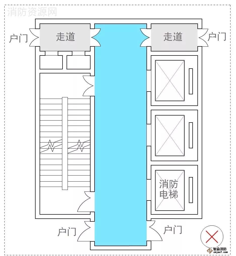 在示例1中,開向前室的門不超過3樘,通常認為可行,示例2、示例3在前室加了一道門,有效規(guī)避了管井、電井門直接開向前室的情況,安全保障有所提升,通常認為可行。