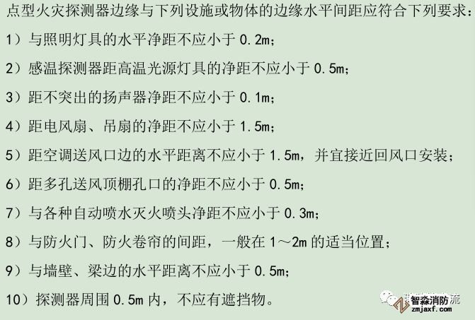 3 至空調(diào)送風口邊的水平距離不應(yīng)小于 1.5m ,并宜接近回風口安裝。探測器至多孔送風頂棚孔口的水平距離不應(yīng)小于 0.5m。