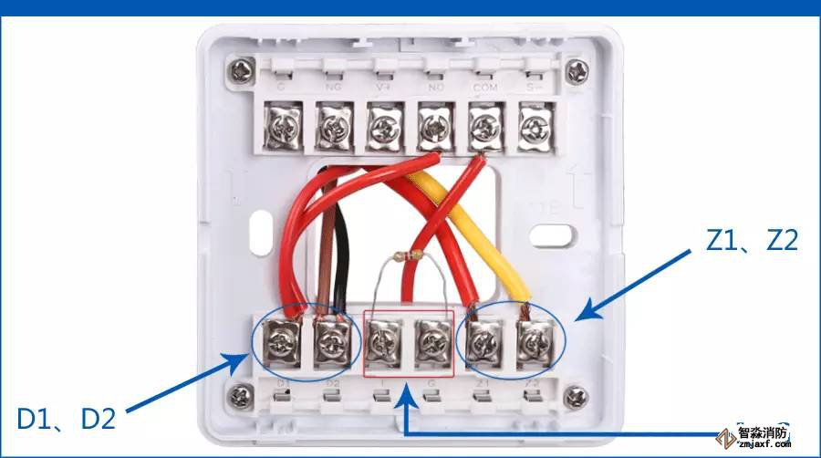 上圖中Z1、Z2是接信號線,可以從就近的9121手動報警按鈕上面并聯(lián)過來;I、G為無源反饋,這里的聲光報警器無法提供無源反饋信號,直接并聯(lián)一個4.7KΩ電阻,另外可以用編碼器將8301模塊設(shè)置成自反饋,模塊啟動后就會自動發(fā)出反饋信號;D1、D2接聯(lián)動電源,直流24V。NO與COM是一組常開觸點,將D1與NO連接,然后COM與D2接線出去直接連接負(fù)載。當(dāng)模塊動作時,COM與NO接通,COM與D2就可以輸出一組24V。