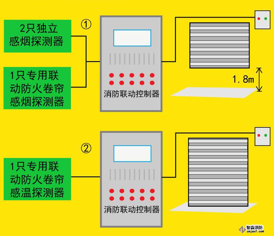 第2步:任一只專門用于聯(lián)動防火卷簾的感溫火災探測器的報警信號應聯(lián)動控制防火卷簾下降到樓板面;在卷簾的任一側距卷簾縱深0.5m~5m內(nèi)應設置不少于2只專門用于聯(lián)動防火卷簾的感溫火災探測器。