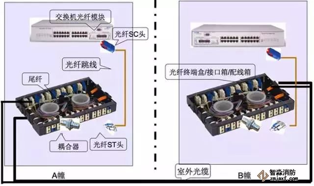 交換機光纖模塊A ─光纖跳線 ─ 耦合器 ─尾纖 ─室外光纜─尾纖─耦合器 ─光纖跳線─交換機光纖模塊B