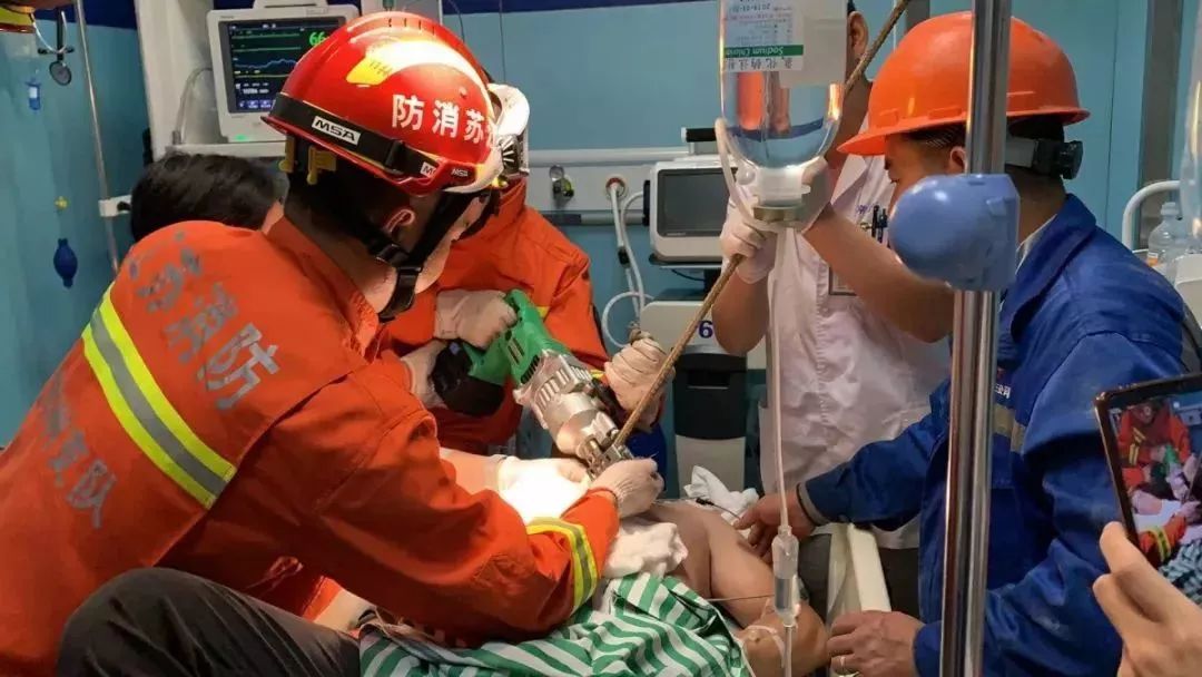 救援人員成功將鋼筋逐一切斷、分割,方便醫(yī)護人員進行手術(shù),據(jù)悉,傷者現(xiàn)生命體征正常。