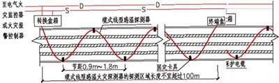 隧道內(nèi)應(yīng)沿電纜設(shè)置線型感溫火災(zāi)探測(cè)器,且在電纜接頭端子等發(fā)熱部位應(yīng)保證有效度;隧道內(nèi)設(shè)置的線型感溫火災(zāi)探測(cè)器可接入電氣火災(zāi)監(jiān)控系統(tǒng)。無外部火源進(jìn)入的電纜隧道應(yīng)在電纜層上表面設(shè)置線型感溫火災(zāi)探測(cè)器;有源入可能的電纜隧道在電纜層上表面和隧道頂部,均應(yīng)設(shè)置線型感溫火災(zāi)探測(cè)器。線型感溫火災(zāi)探測(cè)器采用“S”形布置或有外部火源進(jìn)入可能的電纜隧道內(nèi),能響應(yīng)火焰規(guī)模不大于100mm的線型感溫火災(zāi)探測(cè)器。如圖3所示: