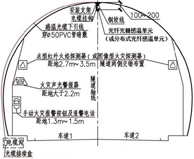 分布式線型感溫火災(zāi)探測(cè)器(或光纖光柵線型感溫火災(zāi)探測(cè)器)應(yīng)設(shè)置在車道頂部距頂棚100mm~200mm,線型感溫火災(zāi)探測(cè)器的間距不應(yīng)大于10m;每根分布式線型感溫火災(zāi)探測(cè)器保護(hù)車道的數(shù)量不應(yīng)超過2條;探測(cè)范圍要求整個(gè)隧道全部覆蓋無探測(cè)盲區(qū)。