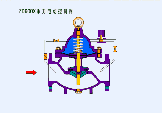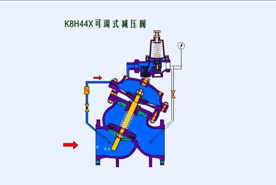 該閥安裝在管道中,主要將上游壓力水解壓到規(guī)定的下游壓力,保證下游用水安全,根據(jù)需要下游壓力事先在導(dǎo)閥上設(shè)定好,當(dāng)下游壓力低于設(shè)定值時(shí),導(dǎo)閥在彈簧的作用下打開(kāi),主閥上控制控制室內(nèi)的壓力水經(jīng)導(dǎo)閥流向下游,控制室內(nèi)的壓力減一,住閥瓣在上游水的作用下打開(kāi),向下游大量供水,當(dāng)下流壓力升高至設(shè)定值時(shí),導(dǎo)閥關(guān)閉,控制室內(nèi)壓力升高,閥門關(guān)閉。