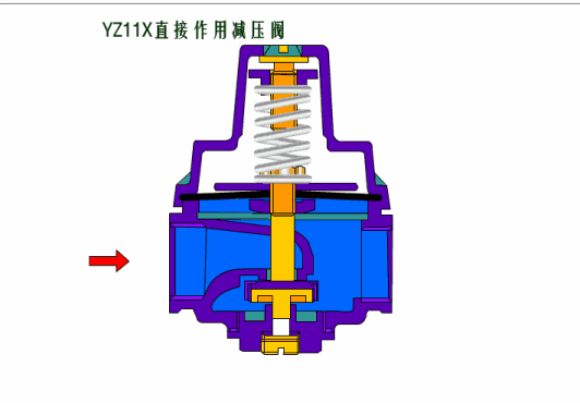 該閥安裝于管路中,主要穩(wěn)定出口壓在設(shè)定的范圍,保證出口的壓力不因進(jìn)口壓力的變化而變化,當(dāng)出口壓力低于設(shè)定值時(shí),閥瓣在彈簧力的作用下打開(kāi),水流通過(guò),當(dāng)出口壓達(dá)到設(shè)定值時(shí),出口壓直接傳遞與膜片下方,與彈簧形成對(duì)抗,使閥瓣關(guān)閉切斷通水。