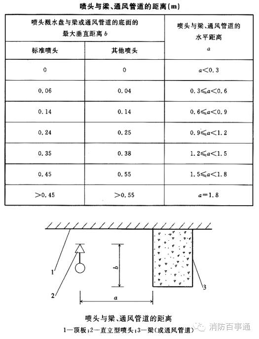 1、直立型、下垂型噴頭與梁、通風(fēng)管道的距離宜符合下表的規(guī)定。