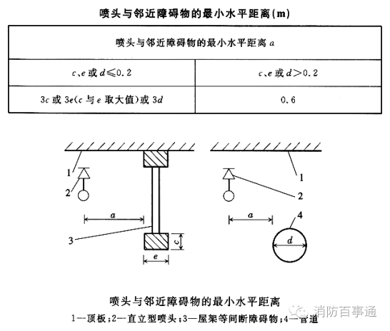 2、直立型、下垂型標(biāo)準(zhǔn)噴頭的濺水盤以下0.45m、其他直立型、下垂型噴頭的濺水盤以下0.9m范圍內(nèi),如有屋架等間斷障礙物或管道時,噴頭與鄰近障礙物的最小水平距離宜符合下表的規(guī)定。