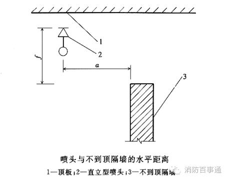 4、直立型、下垂型噴頭與不到頂隔墻的水平距離,不得大于噴頭濺水盤與不到頂隔墻頂面垂直距離的2倍,見下圖。