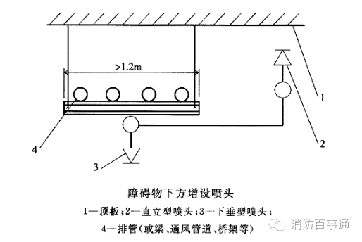 3、當(dāng)梁、通風(fēng)管道、成排布置的管道、橋架等障礙物的寬度大于1.2m時,其下方應(yīng)增設(shè)噴頭,見下圖。增設(shè)噴頭的上方如有縫隙時應(yīng)設(shè)集熱板。