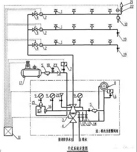 2.自動噴水干式系統(tǒng)一個報警閥組控制的噴頭書不宜超過500只。