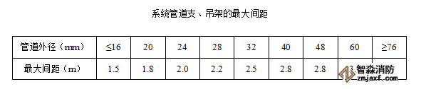 (2)根據(jù)下表給出的最大間距進行支、吊架的安裝,并盡量使安裝間距均勻;