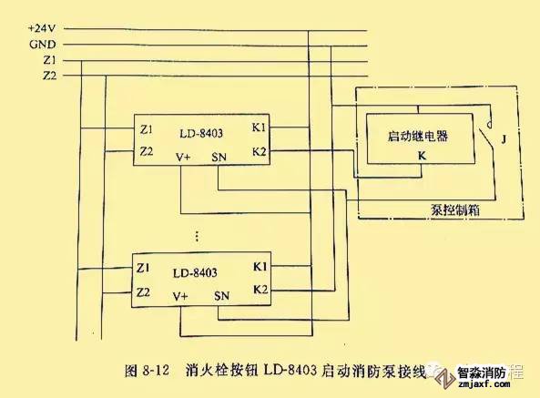消火栓按鈕的信號總線采用RVS型雙絞線,截面積≥1.0m㎡;控制線和應(yīng)答線采用BV線,截面積≥1.5m㎡。用消火栓按鈕LD-8403啟動消防泵的接線如圖8-12所示。