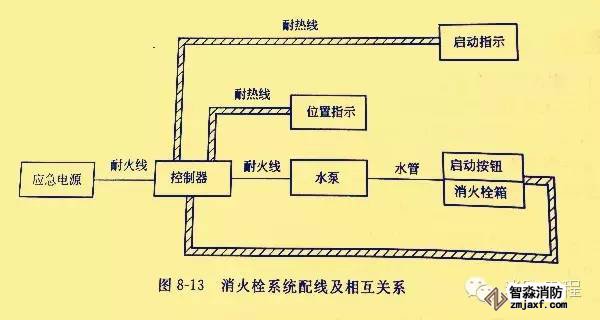 消火栓系統(tǒng)的配線及相互關(guān)系如圖8-13所示。