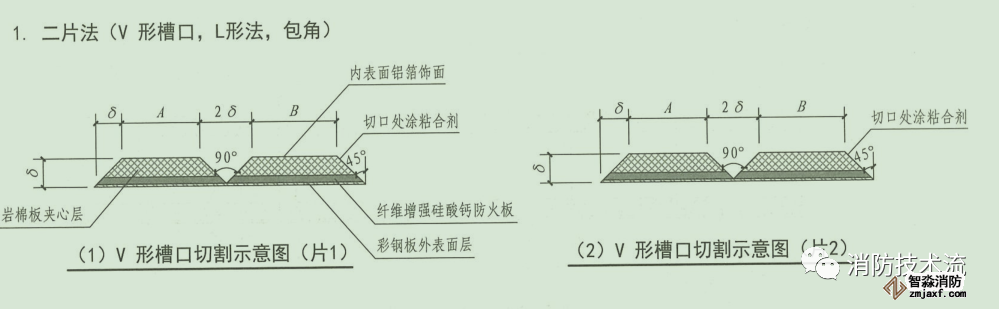 4)板材應(yīng)采用機(jī)械開槽或使用專用刀具進(jìn)行手工開槽,槽口形式為V形,切割時不得破壞彩鋼板表層,且切割縫必須平直。組合采用二片法(通常為L形法),對于大管徑風(fēng)管的包覆宜采用四片法形式。
