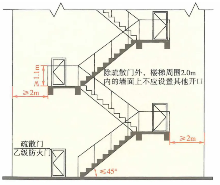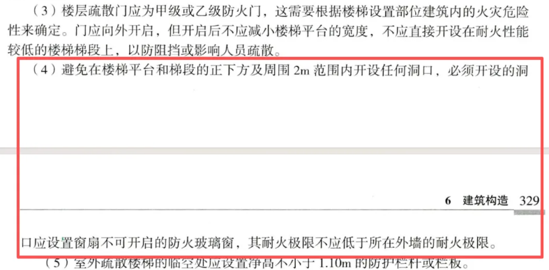 6.4.5-5除疏散門外,樓梯周圍2m內(nèi)的墻面上不應(yīng)設(shè)置門、窗、洞口。疏散門不應(yīng)正對梯段。